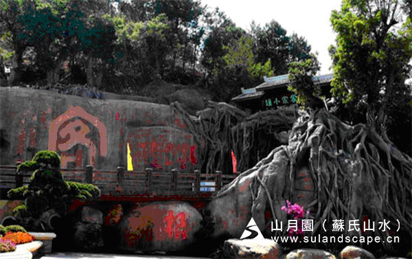 客天下佛雕特色也是一绝,主墙盘古圣境所在的圣人山原是一个荒废的采石场,墙体是以盘古文化为核心设计而成的。圣境中整个雕塑以观音文化为主,雕塑设计源于三十三观音。观音又称观世音、观自在、光世音,尊号位“大慈大悲救苦救难观世音菩萨”。菩萨和佛一样,也有法身、报身和化身。观音菩萨能能展现出三十三化身,演变出三十三观音,这三十三种形象观音能应一切众生的愿望,把他们从各种苦难危急中解救出来。苏氏山水(山月园)从三十三观音选取了有代表性的“持经观音”、“施药观音”、“水月观音”、“千手观音”、“杨柳观音”、“自在观音”、“送子观音”进行雕塑。通过观音菩萨的佛像雕塑与假山的自然结合,观音菩萨的佛像雕塑将梅州的文化与观音摩岩的深厚历史表现出来,把观赏性和文化性相结合表现得更加尽善尽美。
